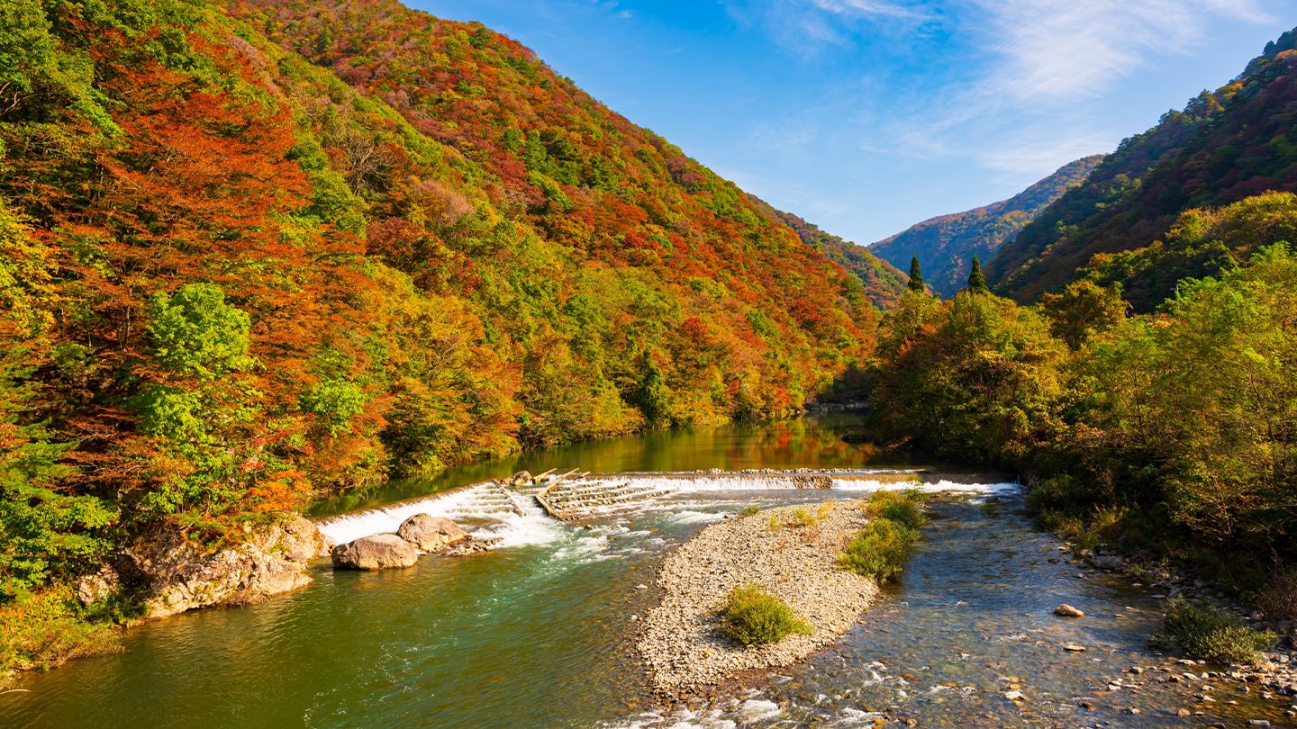 Dakigaeri Gorge is a breathtaking nature spot just outside central Semboku, known for its bright blue river, dramatic cliffs, and lush forest trails. A well-maintained walking path leads visitors through tunnels, over bridges, and to the stunning Mikaeri Waterfall. In autumn, the gorge becomes one of Akita’s most spectacular fall foliage destinations. The contrast of fiery red and gold leaves against the turquoise water is unforgettable. Whether you’re into hiking or scenic photography, Dakigaeri Gorge is one of the top things to do in Akita for outdoor lovers.