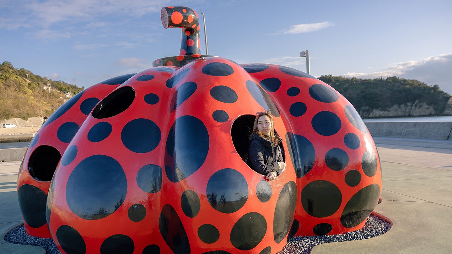 宮浦港の赤かぼちゃは、アーティスト・草間彌生の作品で、到着直後に出会えるフォトスポットとして親しまれています。鮮やかな赤と黒のドットが港景に映え、作品の内部に入ると外と内の境界が反転するような感覚に。フェリー待ちの時間も楽しく過ごせ、島巡りの起点として記憶に残ります。周辺の海沿い散歩と合わせれば、直島観光のテンポが整う直島の見どころ。アートと旅の高揚感をつなぐ直島の観光スポットです。