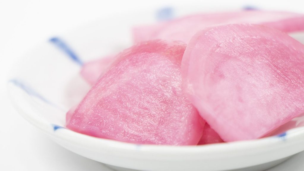 温海かぶは、鶴岡市の温海地域で古くから栽培されてきた伝統野菜で、小ぶりな丸い形と赤紫色の皮が特徴です。薄くスライスして塩漬けや甘酢漬けにすると、鮮やかな紅色とパリッとした食感が楽しめます。寒さにあたることで甘みが増すため、冬の保存食としても重宝されてきました。素朴ながら味わい深く、鶴岡の食卓を彩る伝統野菜のひとつです。
